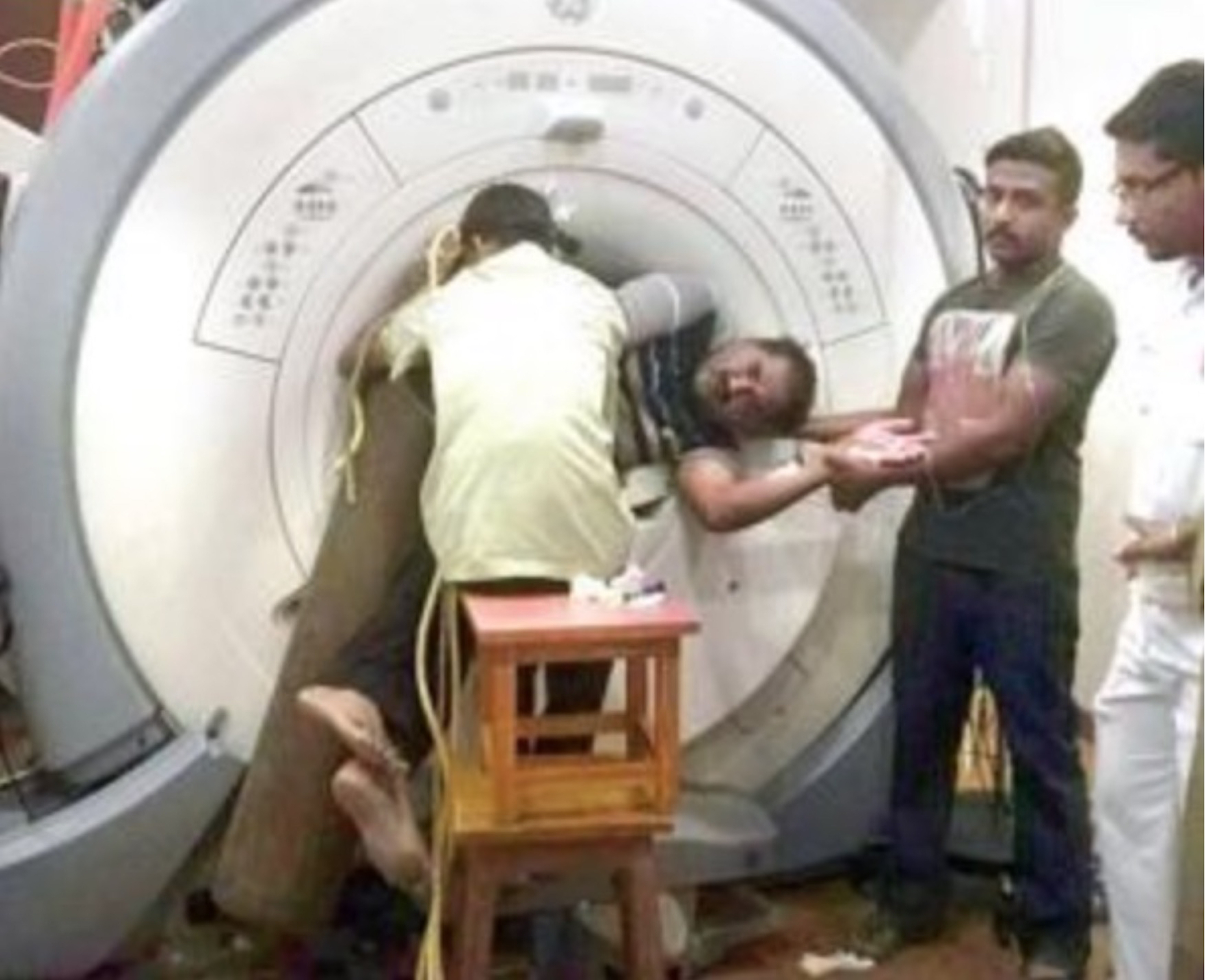 MailOnline, Dan Bloom for. "Two Hospital Workers Spend FOUR HOURS Pinned to MRI Machine in India." Daily Mail Online. December 30, 2014. https://www.dailymail.co.uk/news/article-2890088/Two-hospital-workers-spend-FOUR-HOURS-pinned-MRI-machine-metal-oxygen-tank-catapulted-room-device-s-giant-magnet-turned-on.html.